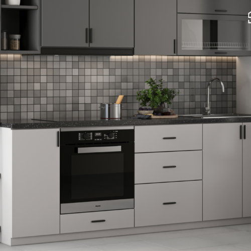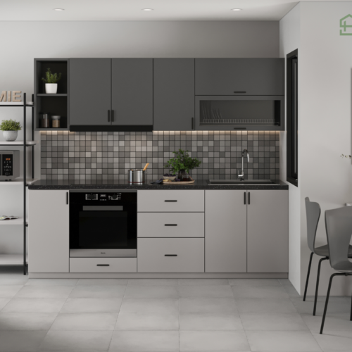 Bếp chữ I phù hợp với không gian căn hộ, hoặc nhà phố với diện tích nhỏ. Bếp được kết cấu 2 phần tủ bếp dưới và tủ bếp trên vẫn đảm bảo không gian lưu trữ và phục vụ nhu cầu sơ chế, nấu nướng.