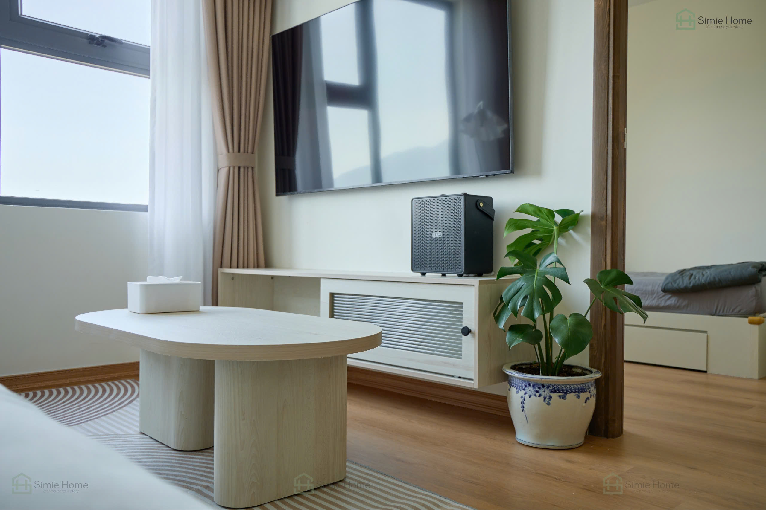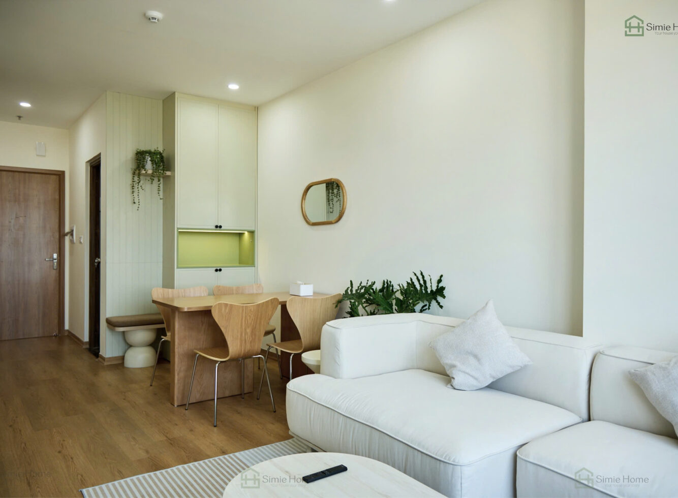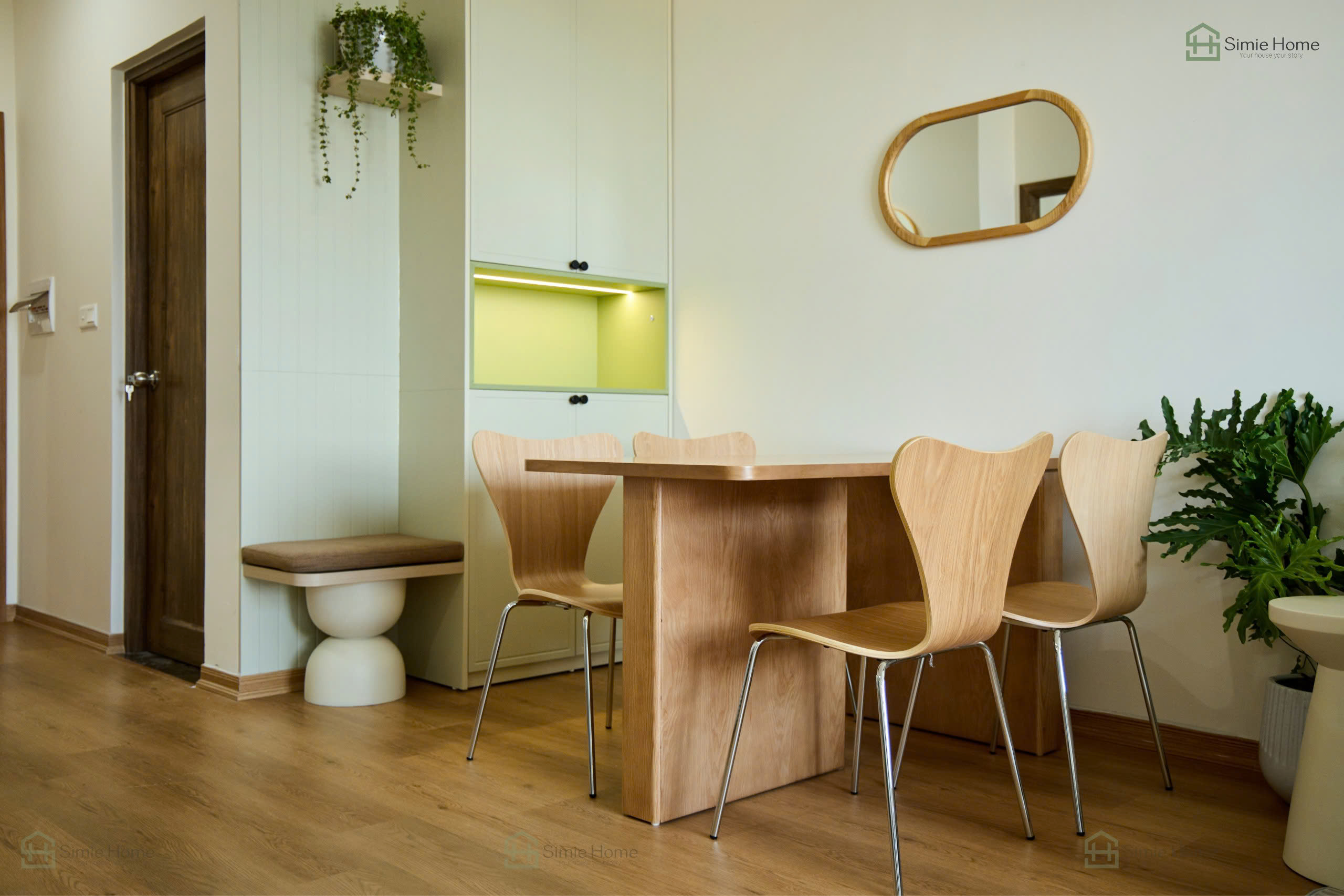Căn hộ được hoàn thiện theo Concept Ori - một concept với đường nét mềm mại giữa việc kết hợp các chi tiết cánh cửa có kẻ chỉ Pano và gỗ với nhiều đường nét bo cong.