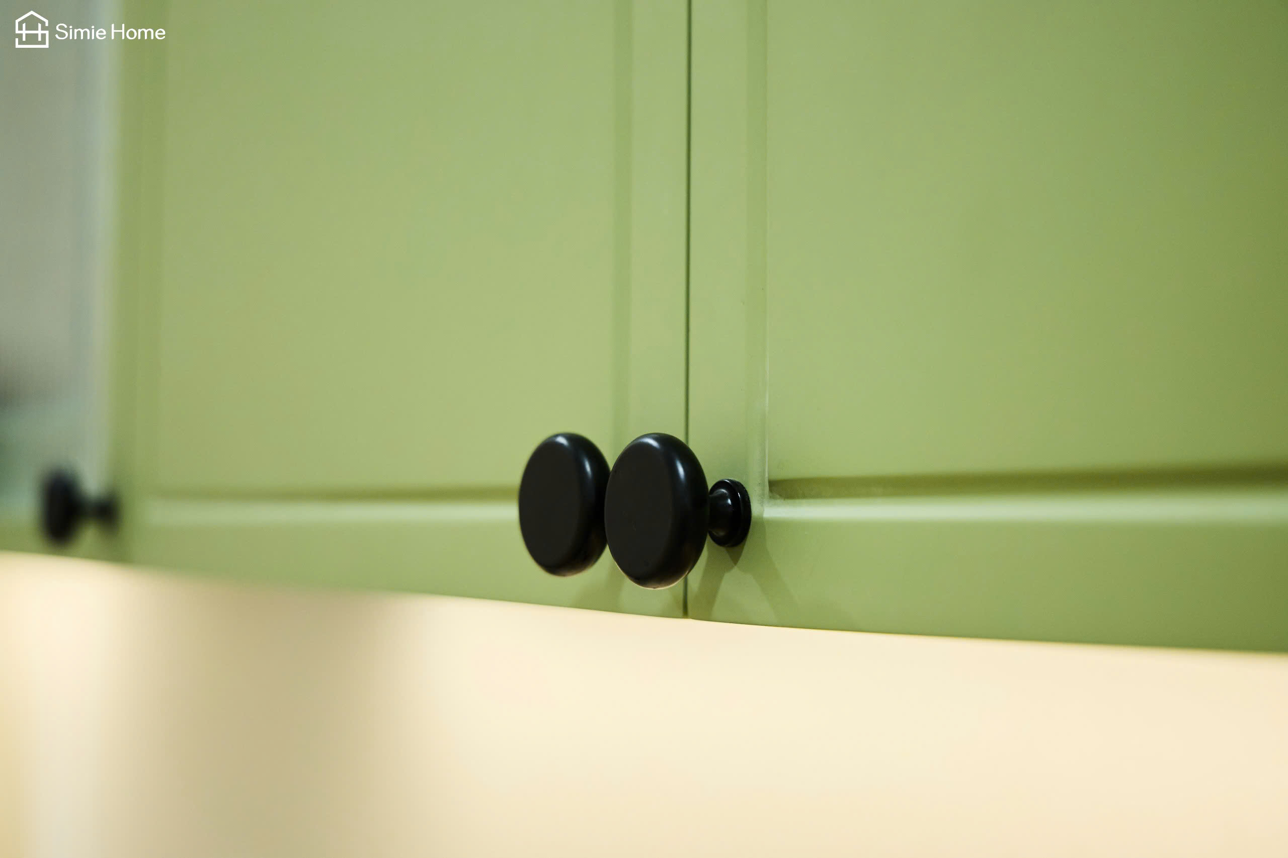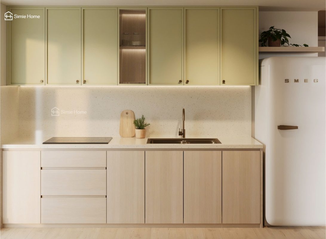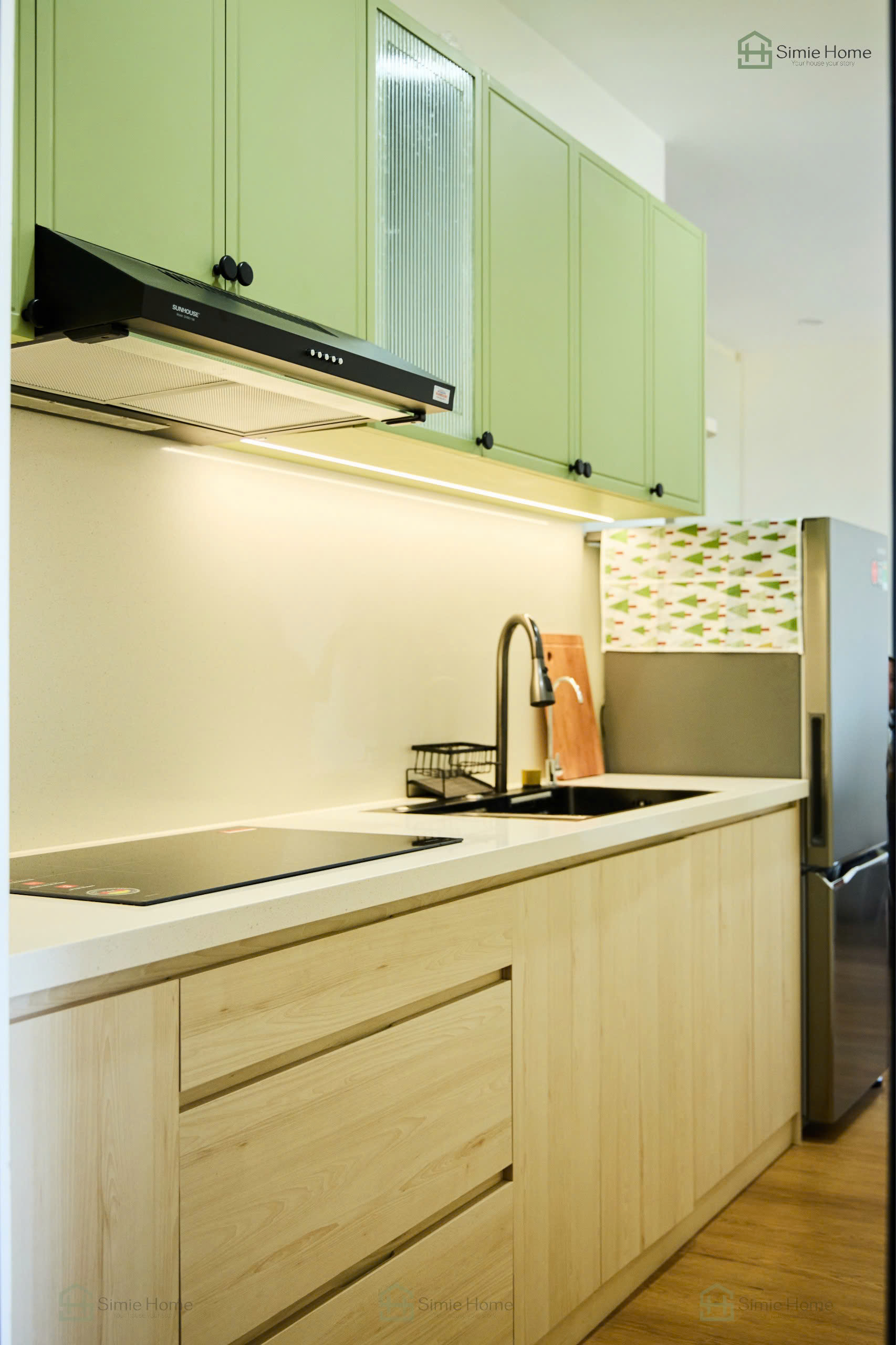 Vật liệu được kết hợp tuỳ khu vực: MDF phủ melamine, MDF phun sơn S8, đá nhân tạo thạch anh Vicostone, gỗ sồi tự nhiên, gỗ Plywood phủ Veneer