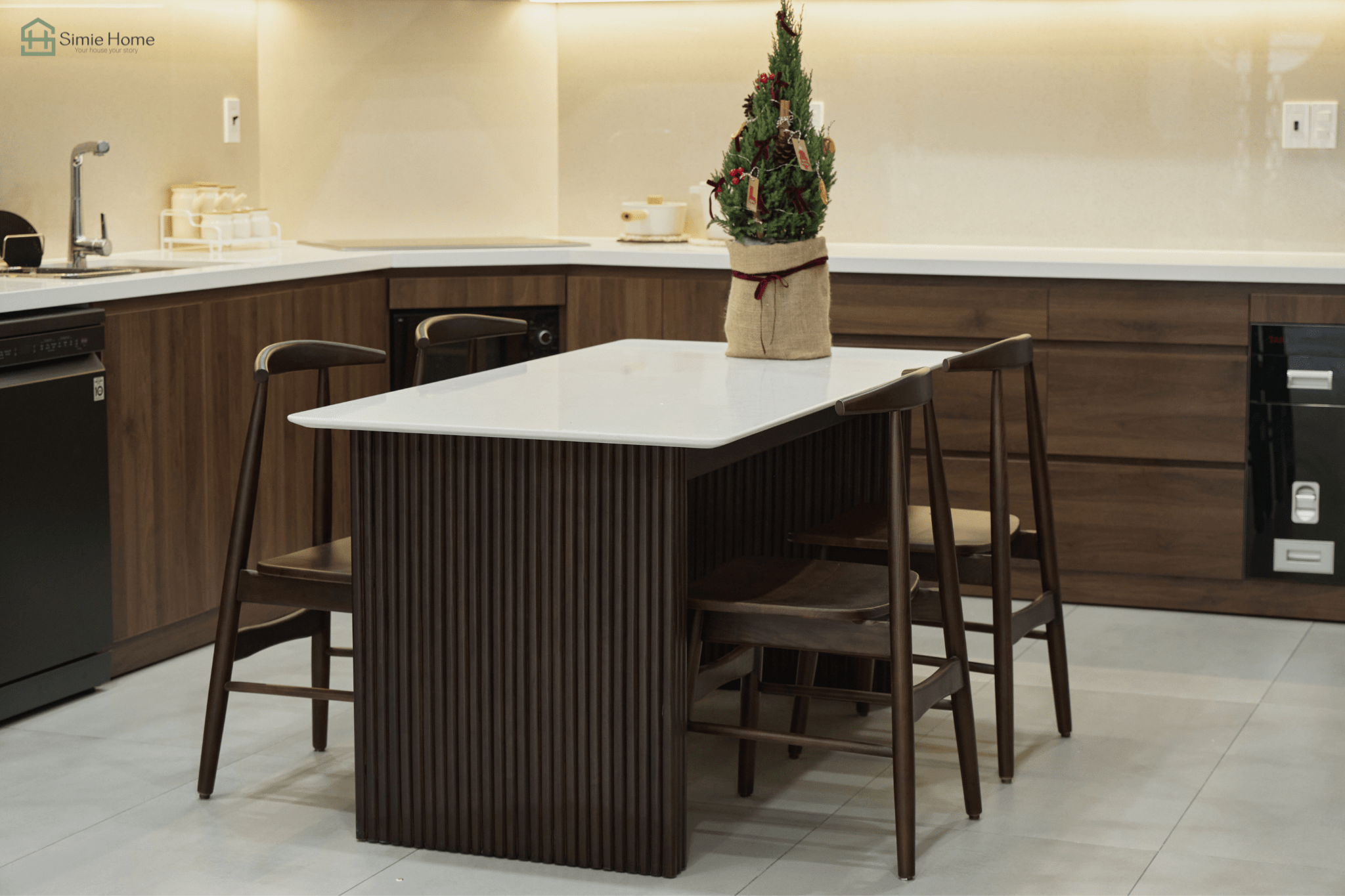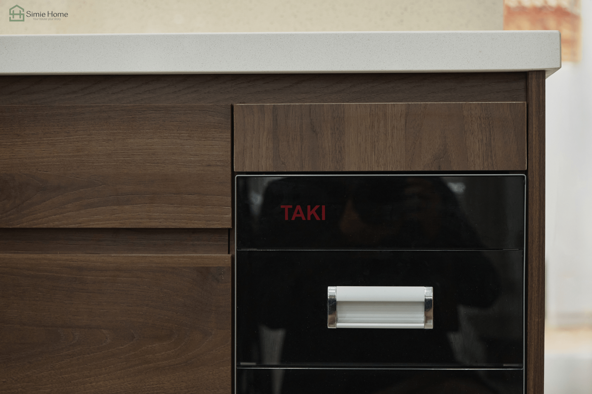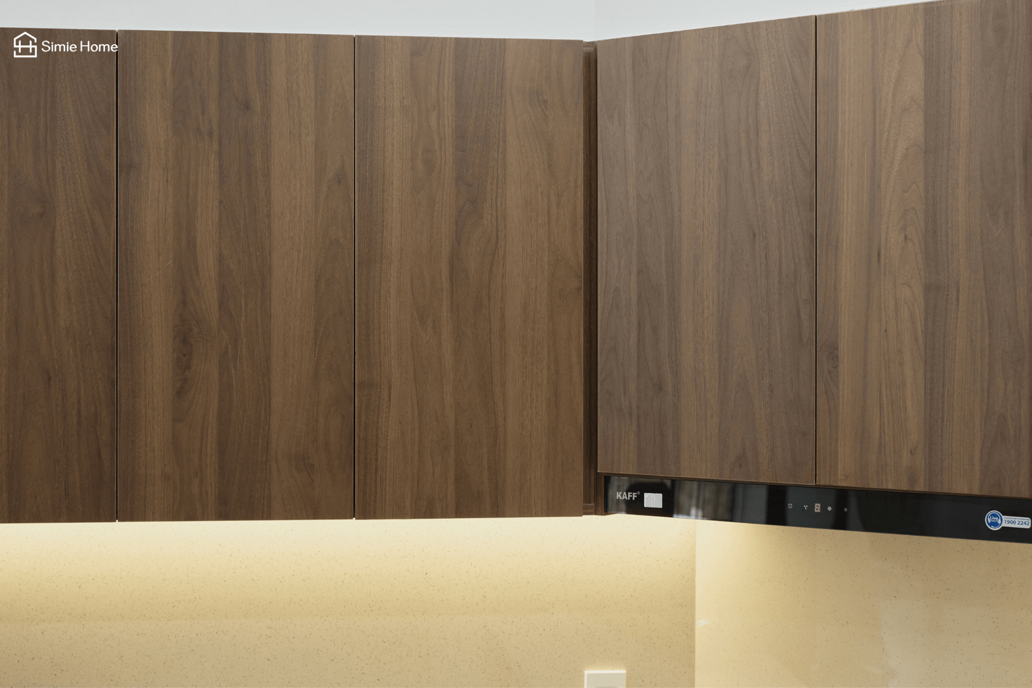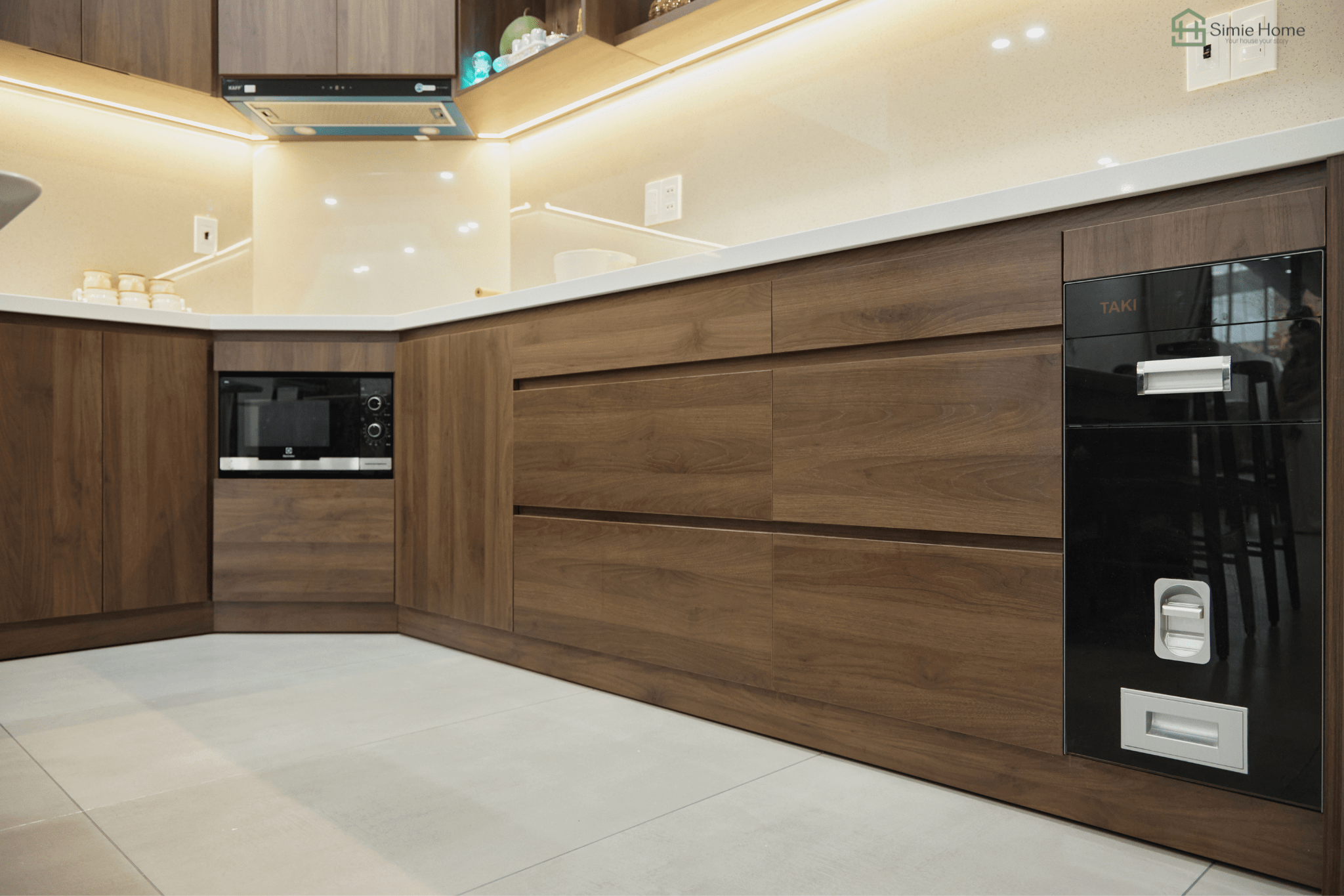 Vật liệu được kết hợp tuỳ khu vực: MDF phủ melamine thương hiệu An Cường và gỗ sồi