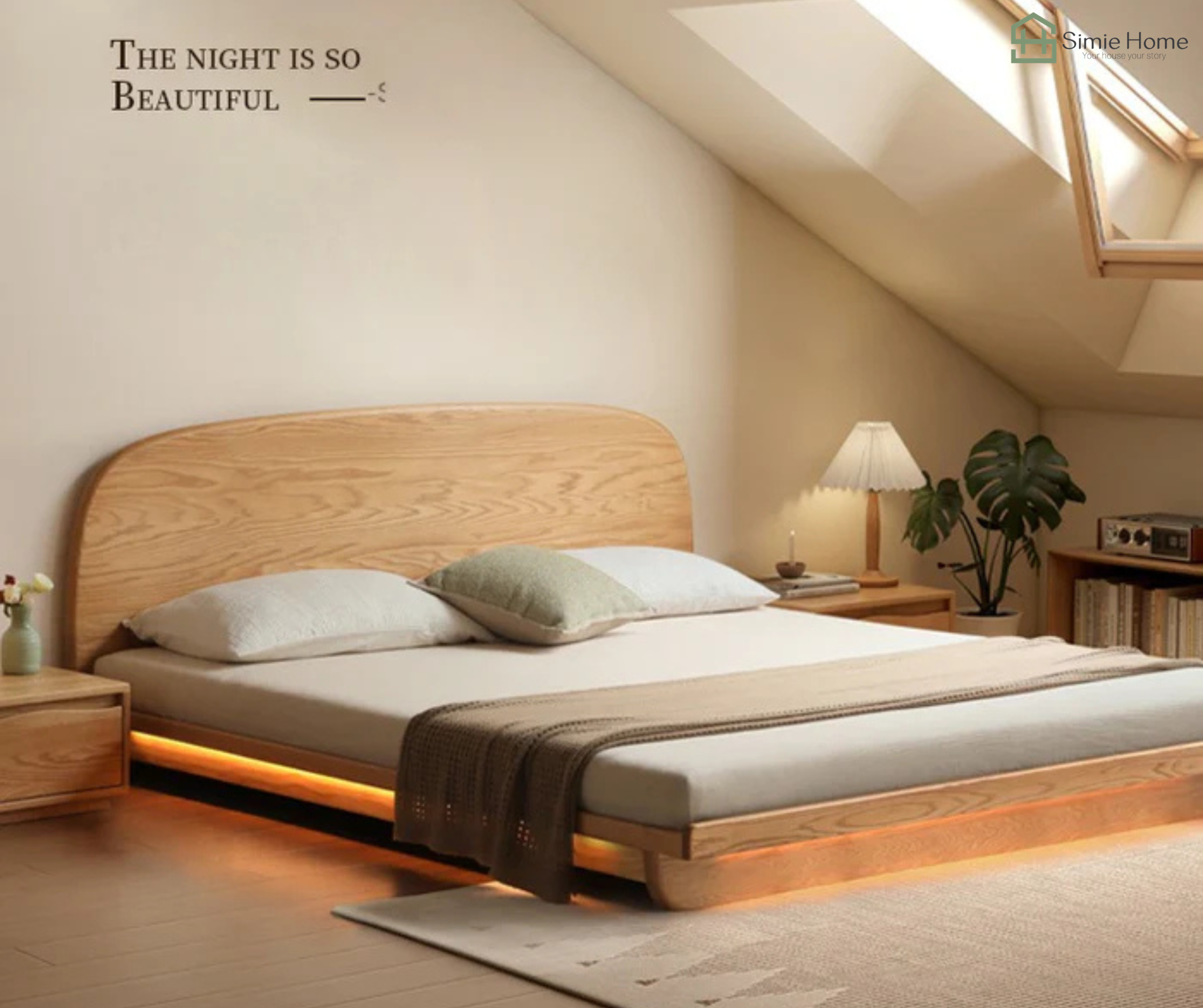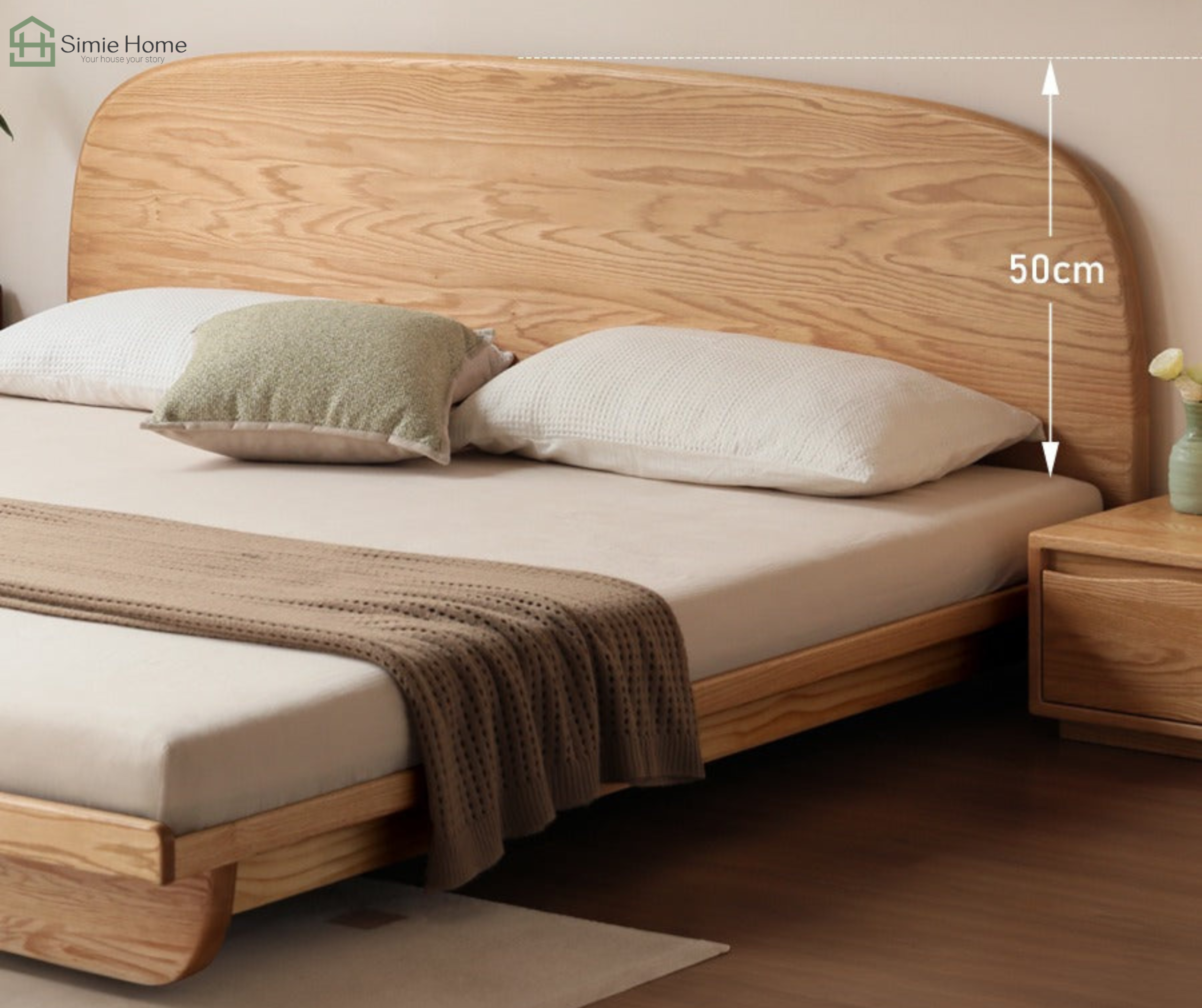 Dáng giường thấp, thiết kế đầu giường bo cong mềm mại cho căn phòng.