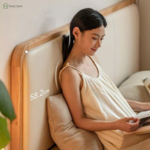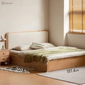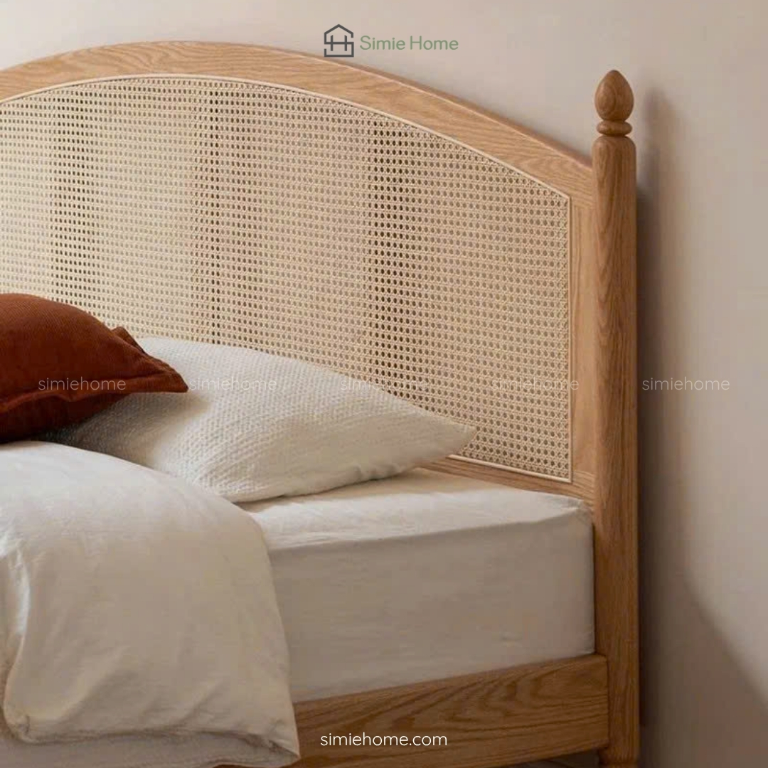 Chất liệu: Khung gỗ sồi tự nhiên phối mây, song giường sắt hộp, mặt nệm gỗ MDF Melamine 17mm