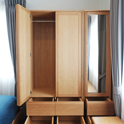 Vân gỗ có màu nâu nhạt nên tạo vẻ đẹp ấm cúng cho không gian. Với tủ quần áo bằng gỗ sồi, bạn có thể yêu cầu thay đổi kích thước, số ngăn, các chi tiết cạnh phức tạp.